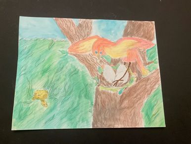 Nadia, a gentle turtle, lives near a moss-covered pond. Lizard makes fun of her shell that has fractured. He decides to poke more holes into her armor. Swelling up with anger, Nadia takes a massive bite out of Lizard’s tail. Lizard’s scream echoes for miles. Nadia mends her broken shell.