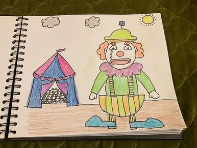 His shoes flap on the muddy ground. His feet leave a round print. His oversized clothes drip with sweat. He eats a wilted sandwich without removing his red nose. He spots someone in the crowded big top.The worn, sweet woman is a face he