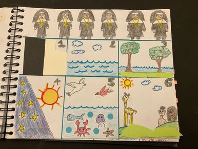 A sea of black and white habits taught that first came light, the sky, dry land, water, plants, and trees. The fourth day brought the sun, moon, and stars. Next, there were the creatures of the sea and endless sky. Land animals and humans completed creation before the Lord rested.